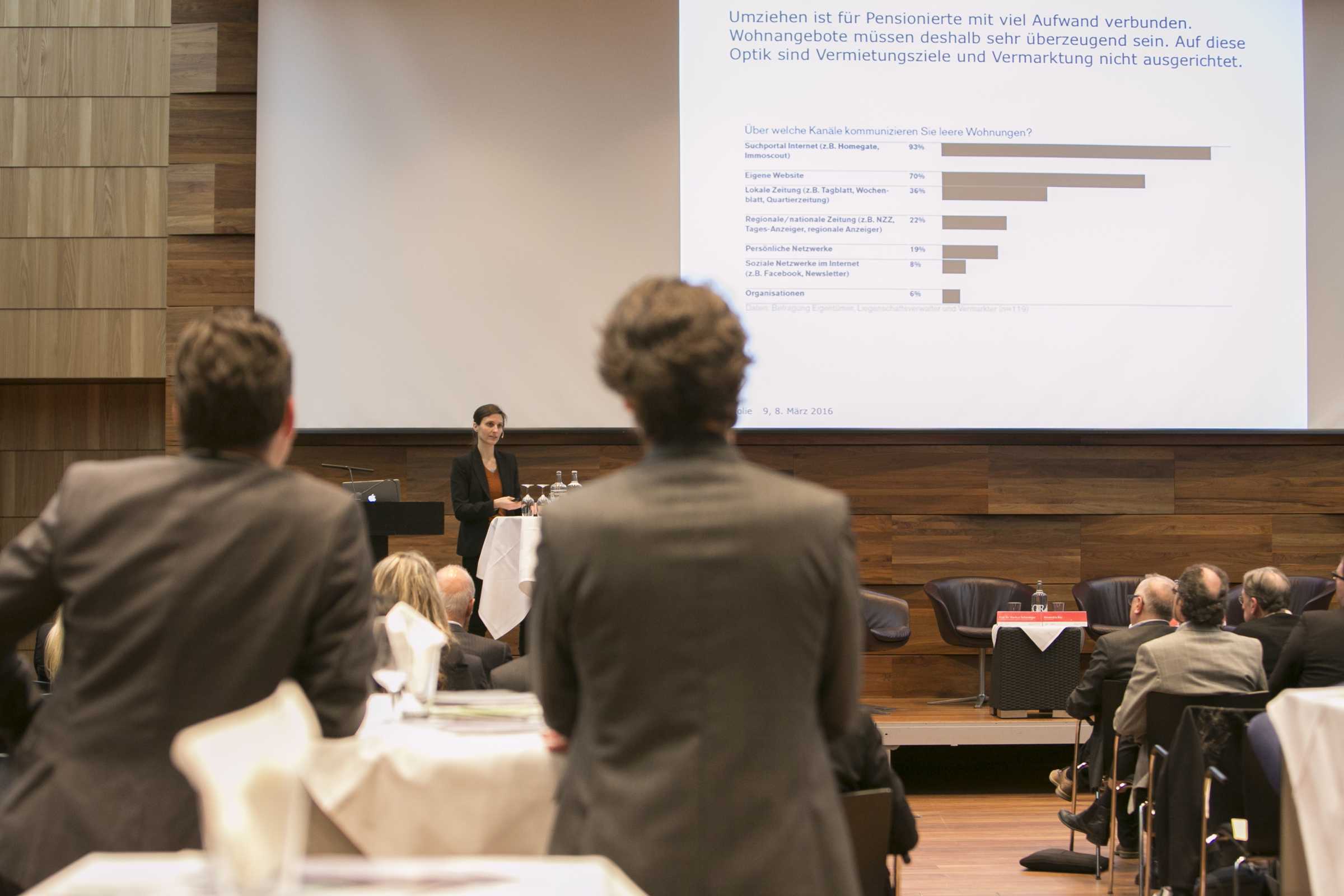 Mobimo then explained its experience in the development of the Aeschbach Quarter in Aarau. She confirmed another study finding that seniors are not per se willing to pay a flat rate for a so-called "retirement infrastructure". Alexandra Bay from the real estate service provider Wincasa then also pointed out that providers of senior residences, such as Tertianum AG, first broke new ground with their special concepts for retirees a good ten years ago and later had to make some changes. Seniors rather demanded a-la-carte offers instead of all-inclusive packages when living in old age, according to Bay.