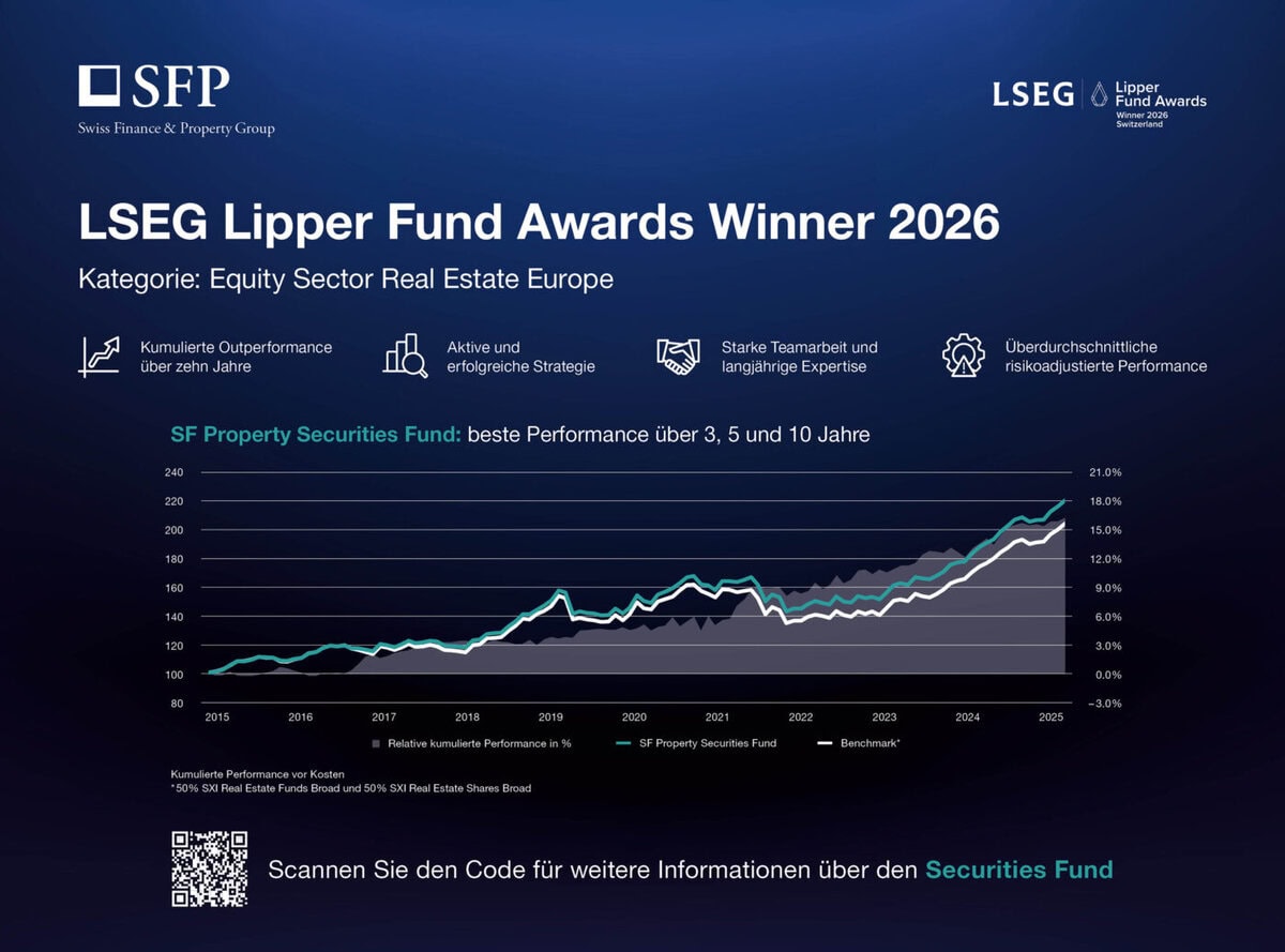 The recognition of the SF Property Securities Fund with the LSEG Lipper Fund Award 2026 in the «Equity Sector Real Estate Europe» category over three, five and ten years is a special moment for Swiss Finance & Property AG. Above all, the award over ten years confirms that a disciplined investment process also proves its worth over different market cycles.