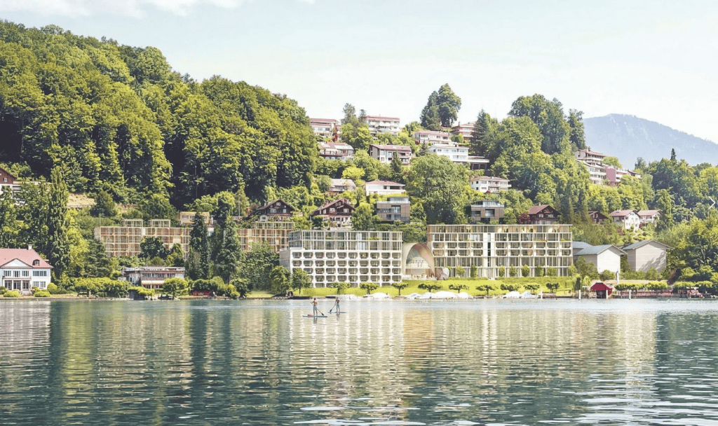 Hermitage Lake Lucerne AG has publicly presented a revised design plan for its almost 20,000 square meter site at Seeburgstrasse 72 in Lucerne. According to plans by Herzog & de Meuron, the hotel on the site directly on Lake Lucerne is to be expanded from its current 90 rooms to around 100 and apartments are to be built for the first time. A total of around 36 units are planned.