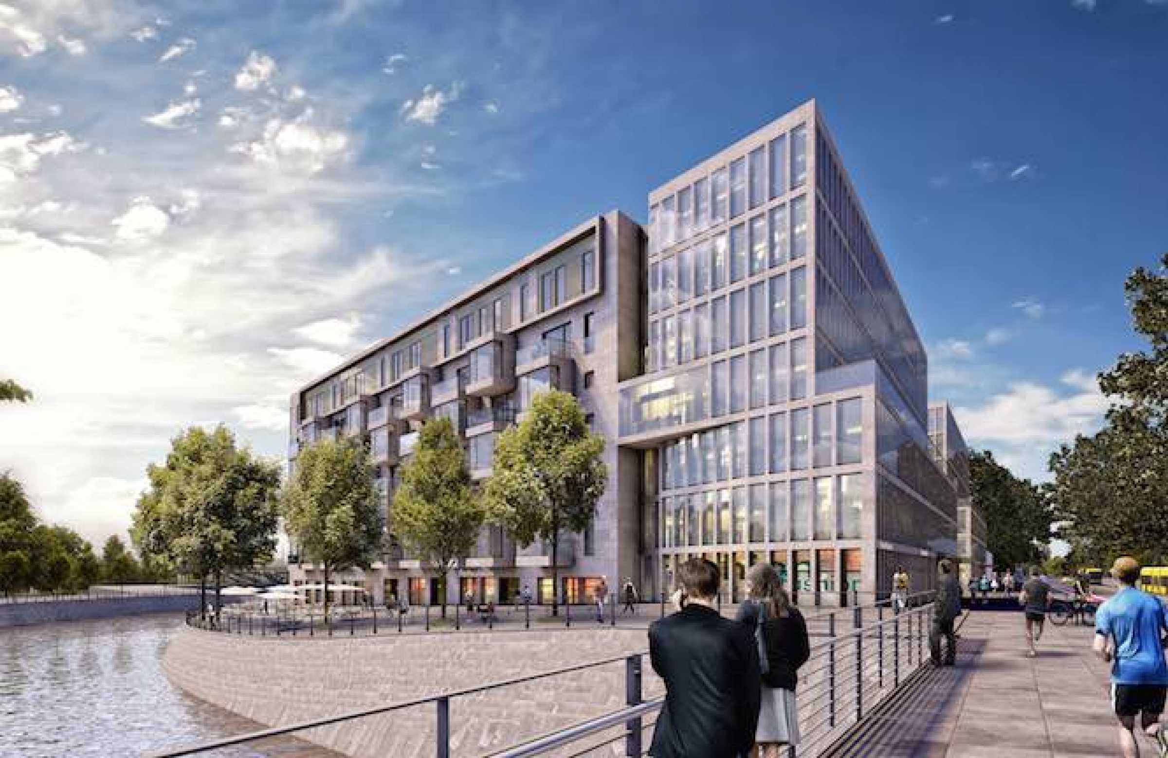 Environ 43.000 m² de surface brute de plancher (BGF) seront construits dans un emplacement de choix, directement au bord de l'eau et en face du quartier gouvernemental. Il s'agit en détail d'environ 190 appartements à louer, de 9.200 m² de bureaux ainsi que d'environ 5.600 m² de surfaces de vente au détail et de restauration, dont une partie est déjà louée. En outre, il y a 170 places de parking souterrain.